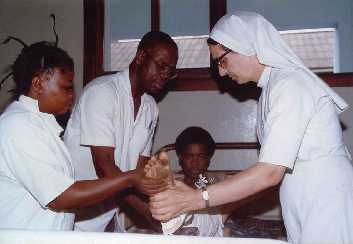 Sister Dinarosa Belleri of the Congregation of the Sisters of the Poor helps a patient in Mosango, Congo, in 1992. She was among six members of her congregation who died after contracting Ebola while caring for others suffering from the virus in Kikwit, Congo, in 1995. (CNS photo/courtesy Congregation of the Sisters of the Poor)