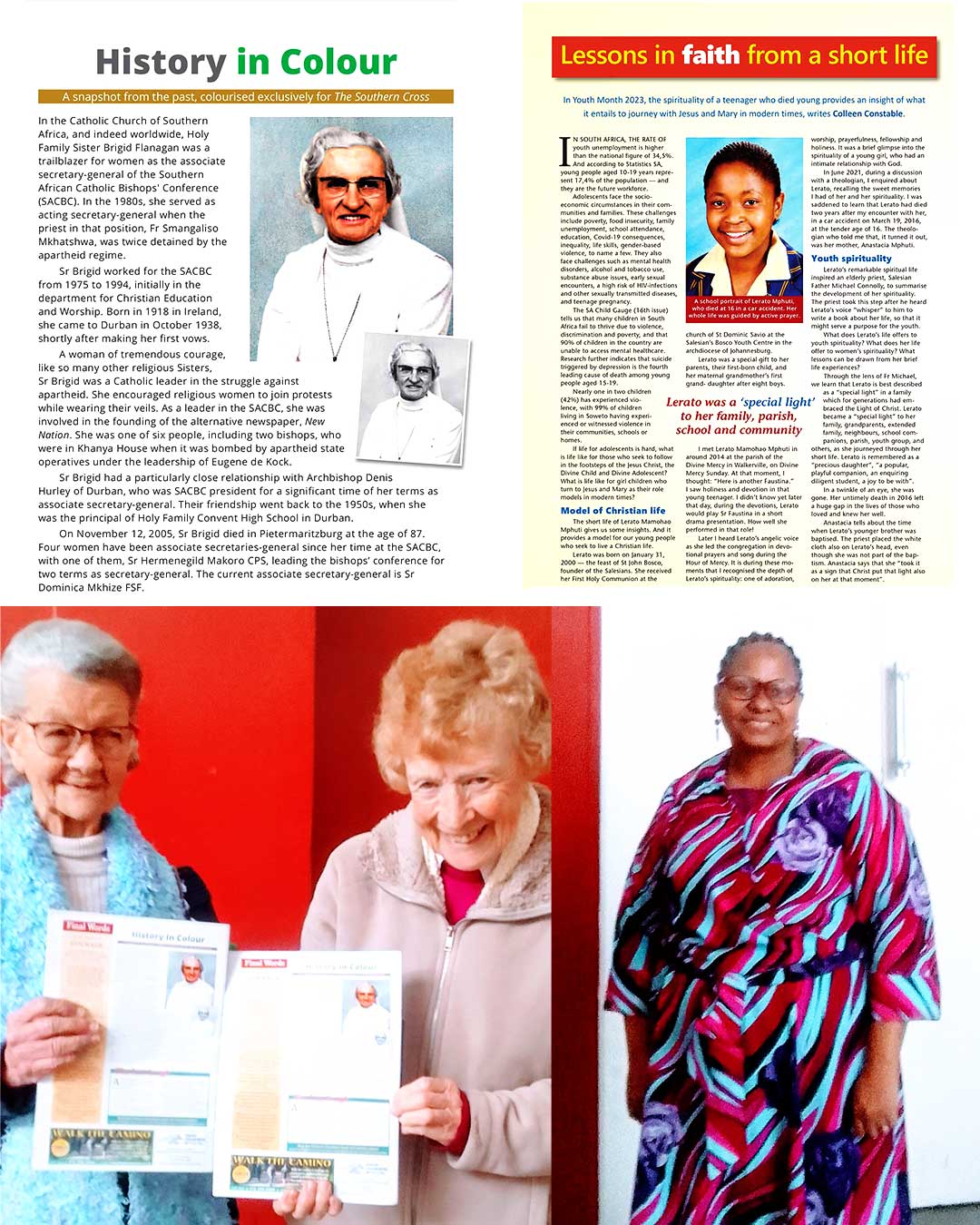 Top: Articles in the Southern Cross magazine on Brigid Flanagan HFS and Lerato Mphuti. Bottom: Holy Cross sisters Sr Kathleen Mitchell (left) and (right) Sr Joy Money. Anastacia Mphuthi, mother of Lerato Mphuti