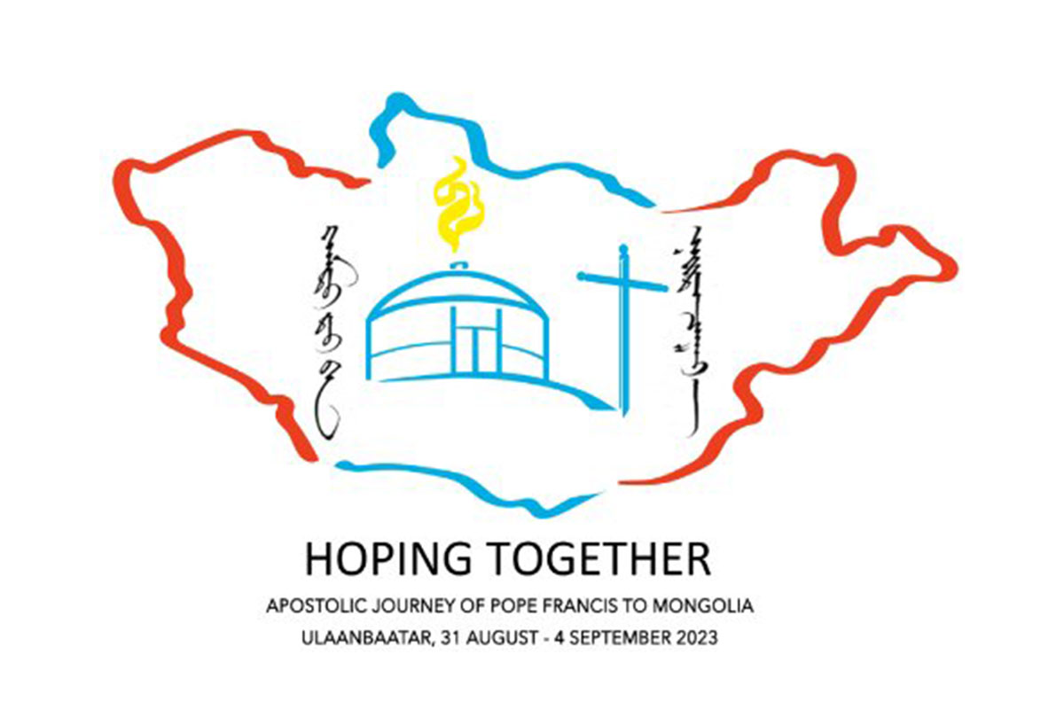 This is the logo for the Aug. 31-Sept. 4, 2023, visit of Pope Francis to Mongolia and its capital, Ulaanbaatar. The logo shows an outline of the borders of Mongolia painted in the colours of the nation’s flag and containing a cross and a traditional Mongolian dwelling from which rises smoke-coloured yellow to represent the Vatican. The two vertical inscriptions say the theme, “Hoping together,” in Mongolian. (CNS photo/Holy See Press Office)
