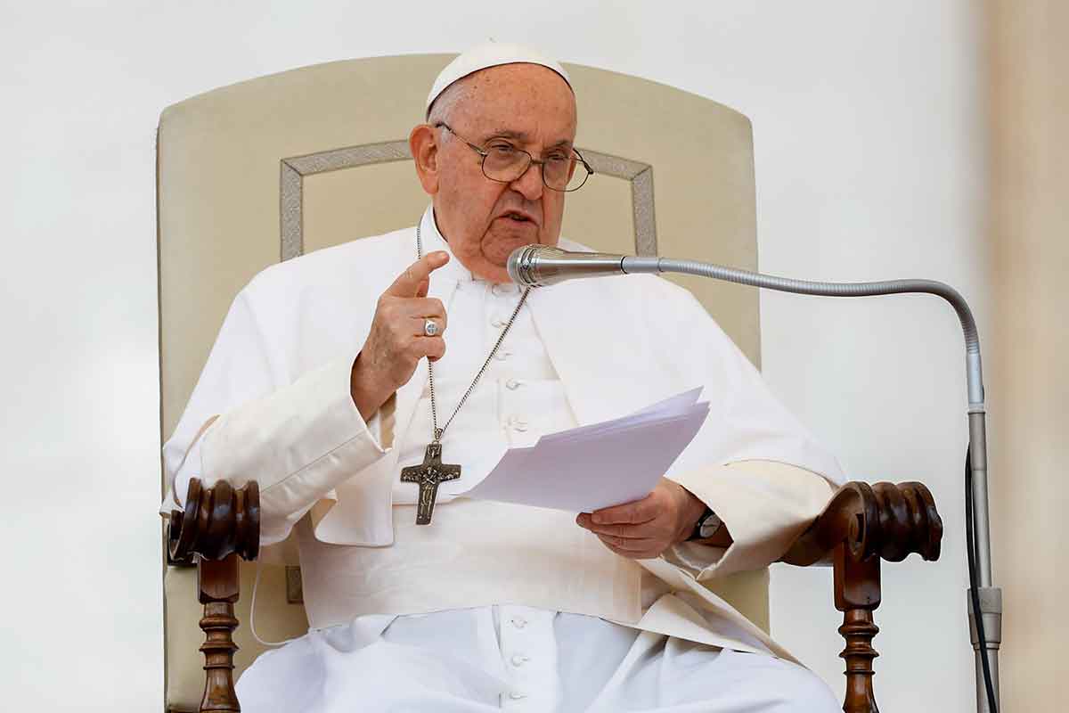 Pope Francis leads a prayer as he begins his weekly general audience in St. Peter’s Square at the Vatican Sept. 20, 2023. (CNS photo/Lola Gomez)