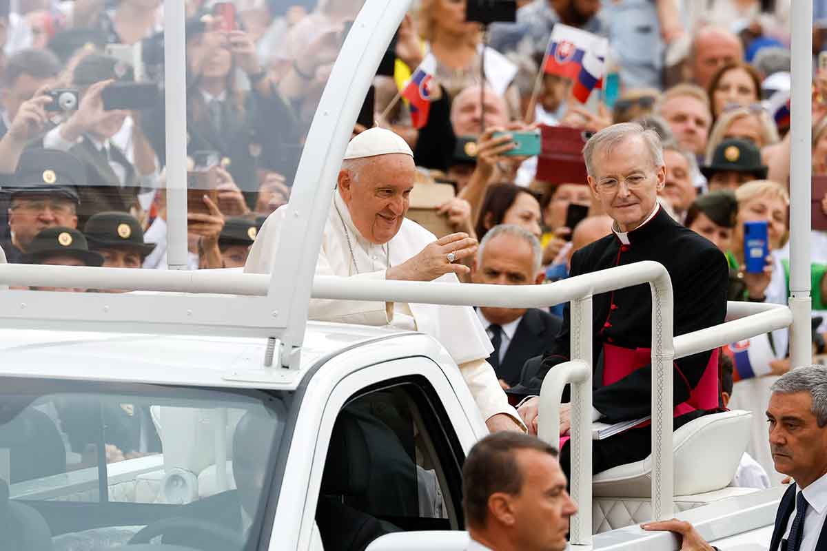 Pope Francis greets visitors from the popemobile as he rides around St. Peter’s Square at the Vatican before his weekly general audience Sept. 20, 2023. (CNS photo/Lola Gomez)