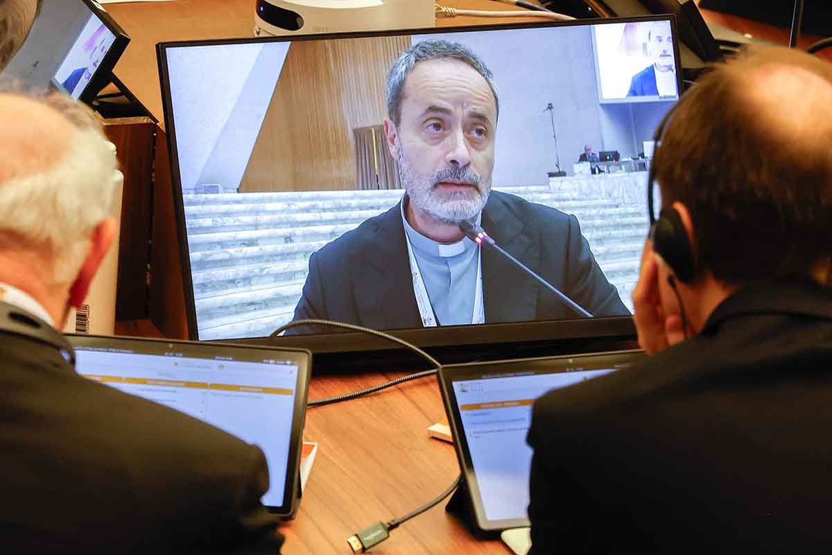Father Giuseppe Bonfrate, a professor at Rome’s Pontifical Gregorian University and a president delegate of the synod, is seen on a video screen during a working session of the assembly of the Synod of Bishops in the Vatican’s Paul VI Audience Hall Oct. 23, 2023. (CNS photo/Lola Gomez)