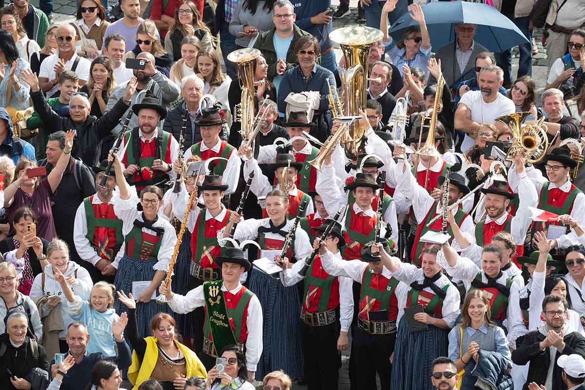 Members of a band from Longomoso, Italy, raise their instruments as Pope Francis greets them after reciting the Angelus prayer in St. Peter’s Square at the Vatican Nov. 5, 2023. (CNS photo/Vatican Media)