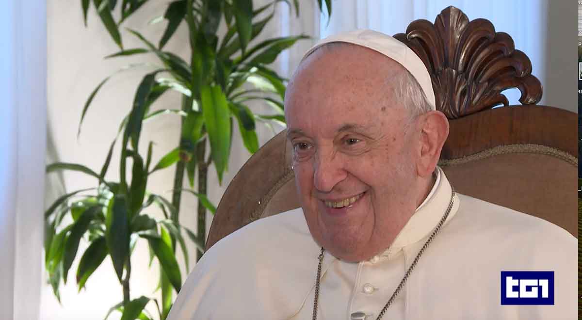 Pope Francis smiles during an interview with Gian Marco Chiocci, director of the TG1 news program of RAI, the Italian television network, in this screen grab from a broadcast Nov. 1, 2023. (CNS photo/TG1 via RaiPlay)