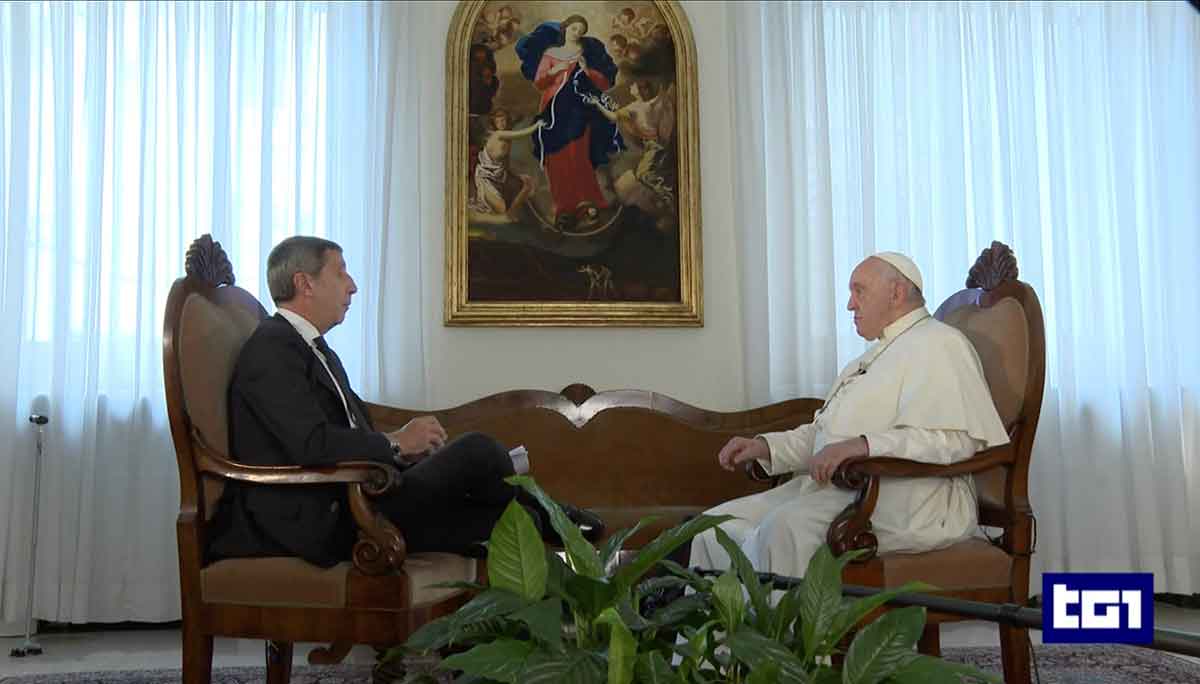 Pope Francis listens to a question from Gian Marco Chiocci, director of the TG1 news program of RAI, the Italian television network, in this screen grab from an interview broadcast Nov. 1, 2023. (CNS photo/TG1 via RaiPlay)