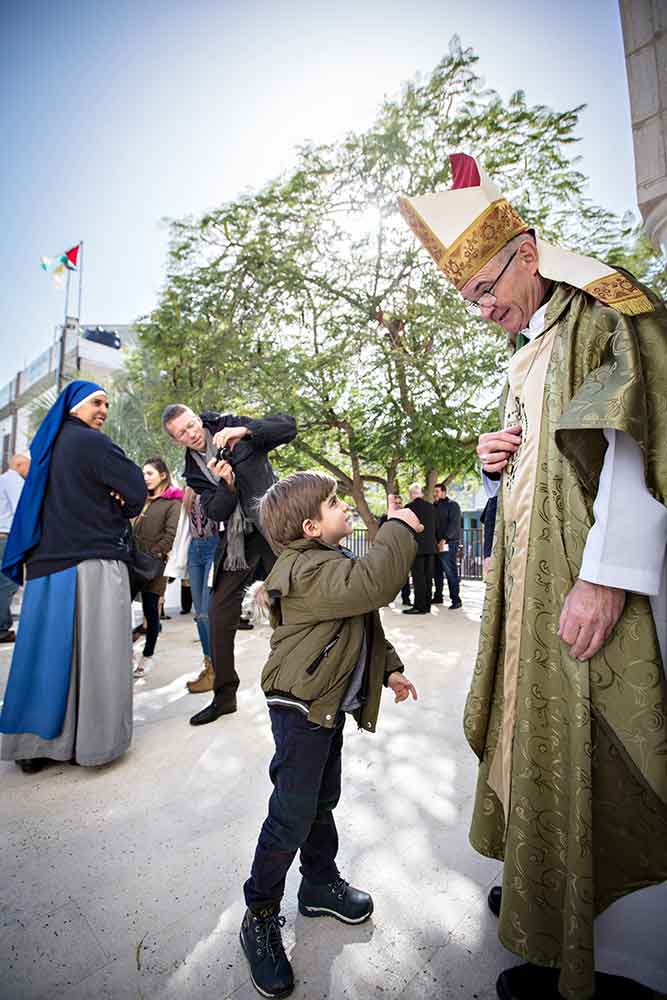 Archbishop Stephen Brislin of Cape Town, South Africa, greets a boy after concelebrating Mass Jan. 14 at Holy Family Parish in the Gaza Strip. (CNS photo/Marcin Mazur, Bishops’ Conference of England and Wales)