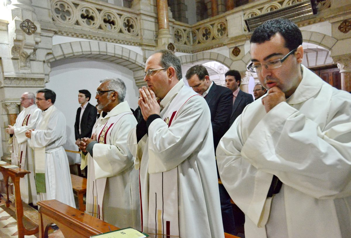 Bishops from around the world pray during a Jan. 12 Mass at the Carmelite Monastery in Bethlehem, West Bank. Sixteen bishops of the Holy Land Coordination were on a two-day visit to Gaza Jan 11-12. (CNS photo/Debbie Hill)
