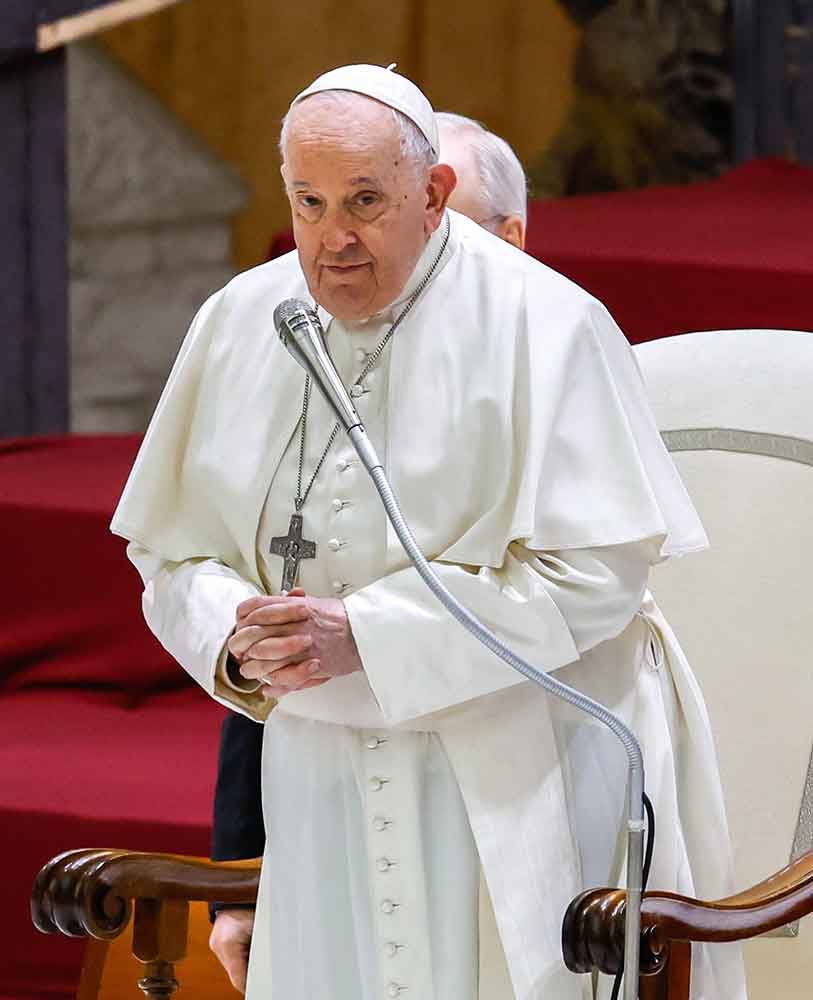 Pope Francis begins his weekly general audience in the Paul VI Audience Hall at the Vatican Dec. 13, 2023. (CNS photo/Lola Gomez)