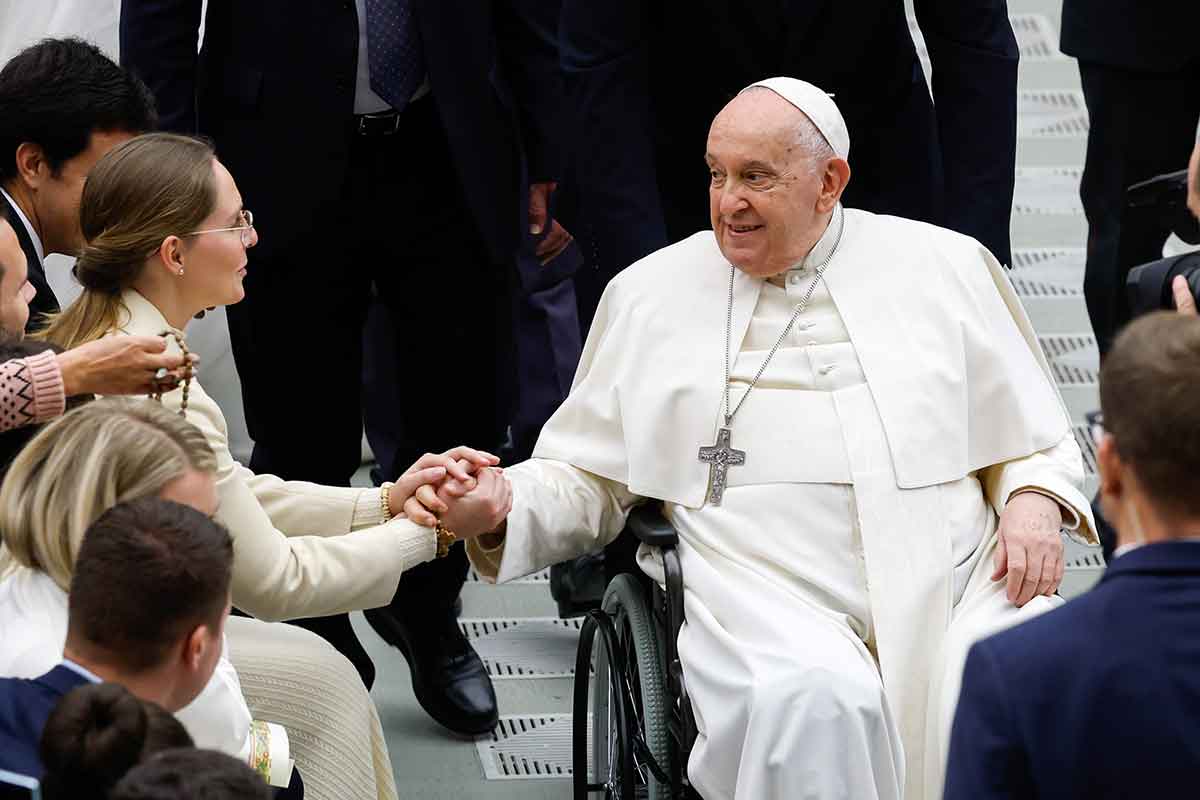 Pope Francis greets a newlywed couple at the end of his weekly general audience in the Paul VI Audience Hall at the Vatican Dec. 13, 2023. (CNS photo/Lola Gomez)