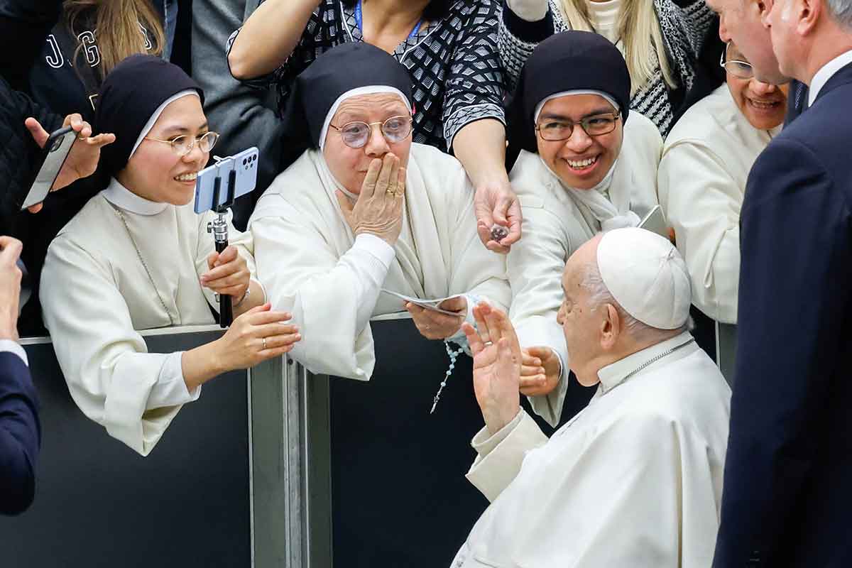 Pope Francis greets religious sisters at the end of his weekly general audience in the Paul VI Audience Hall at the Vatican Dec. 20, 2023. (CNS photo/Lola Gomez)