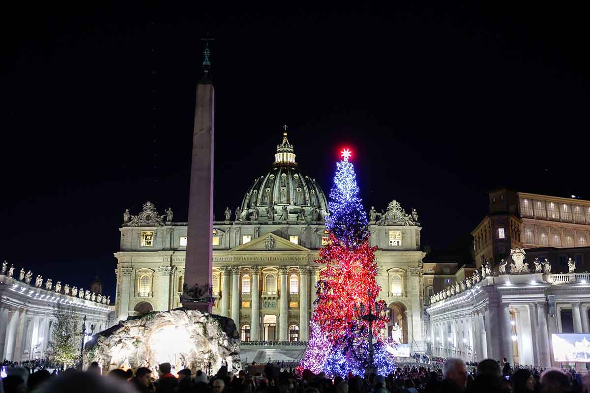 The Nativity scene is unveiled and the Christmas tree is lighted in St. Peter’s Square at the Vatican Dec. 9, 2023. (CNS photo/Lola Gomez)