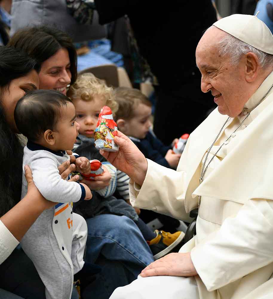 Pope Francis gives a chocolate Santa to a child after his weekly general audience in the Paul VI Audience Hall at the Vatican Jan. 3, 2023. (CNS photo/Vatican Media)