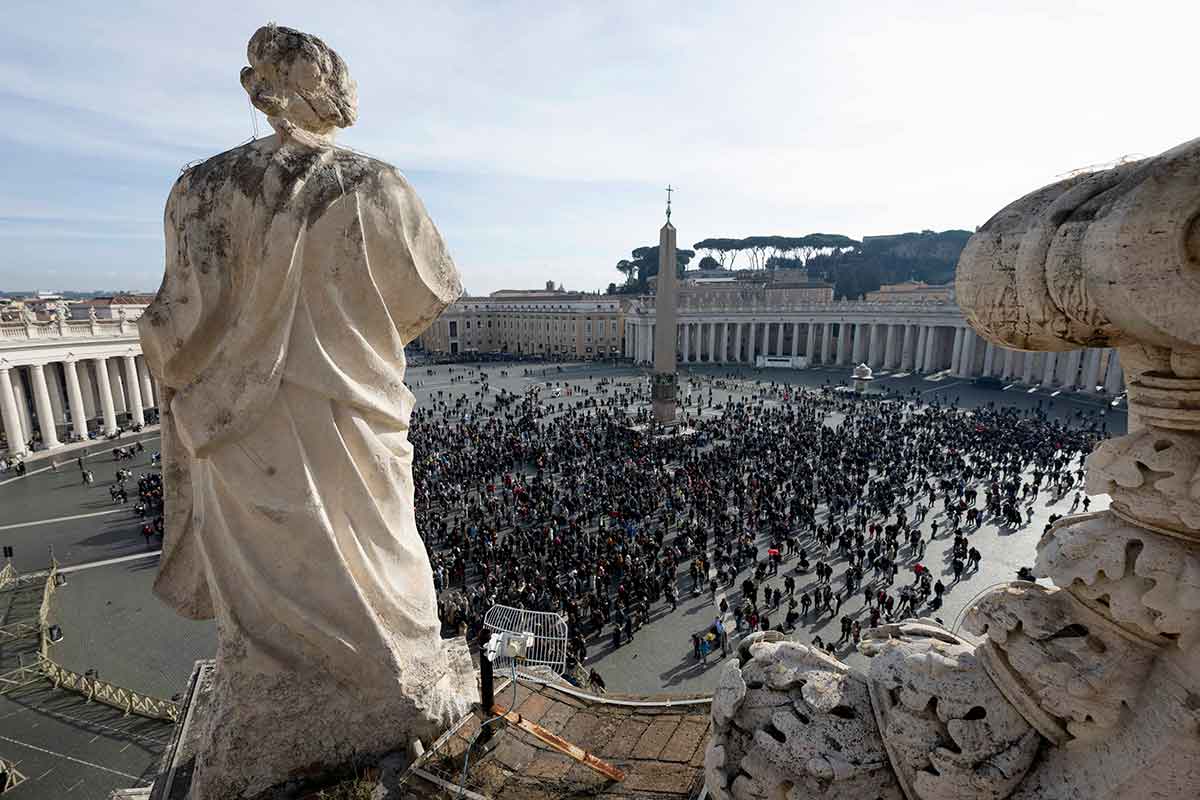 Visitors are gathered in St. Peter’s Square at the Vatican to join Pope Francis for the recitation of the Angelus prayer Jan. 14, 2024. (CNS photo/Vatican Media)