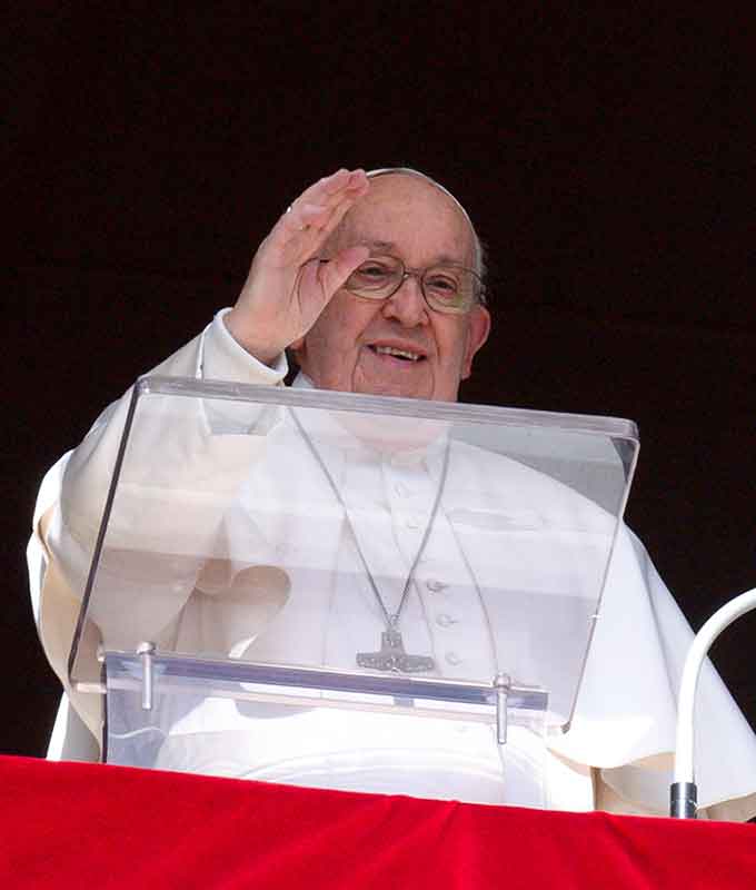Pope Francis greets visitors gathered to pray the Angelus in St. Peter’s Square at the Vatican Feb. 25, 2024. (CNS photo/Vatican Media)