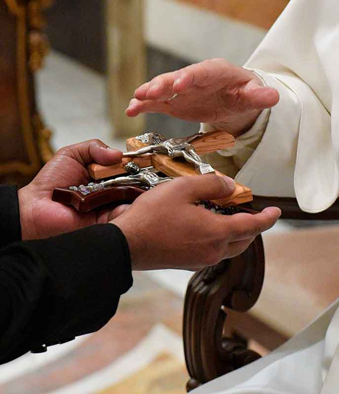 Pope Francis blesses crucifixes for a participant in a Vatican course on confession offered by the Apostolic Penitentiary, the Vatican tribunal that deals with matters of conscience, March 8, 2024, in the Vatican’s Apostolic Palace. (CNS photo/Vatican Media)