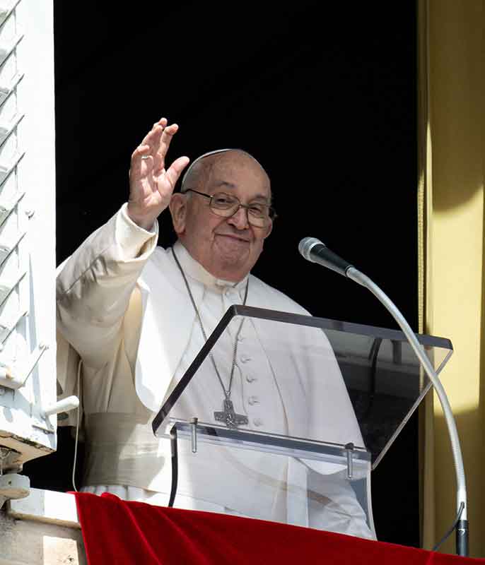 Pope Francis greets visitors gathered in St. Peter’s Square to pray the Angelus at the Vatican March 17, 2024. (CNS photo/Vatican Media)