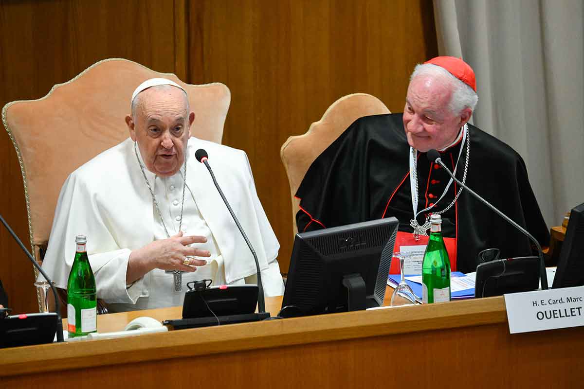 Pope Francis, seated next to Cardinal Marc Ouellet, head of the Center for Research and Anthropology of Vocations and former prefect of the Dicastery for Bishops, addresses attendees at an international congress titled, “Man-Woman: Image of God. For an Anthropology of Vocations,” in the Vatican’s Synod Hall March 1, 2024. (CNS photo/Vatican Media)