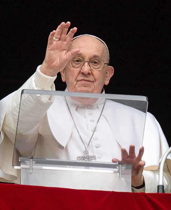 Pope Francis greets visitors gathered in St. Peter’s Square for the recitation of the Angelus prayer at the Vatican March 10, 2024. (CNS photo/Vatican Media)