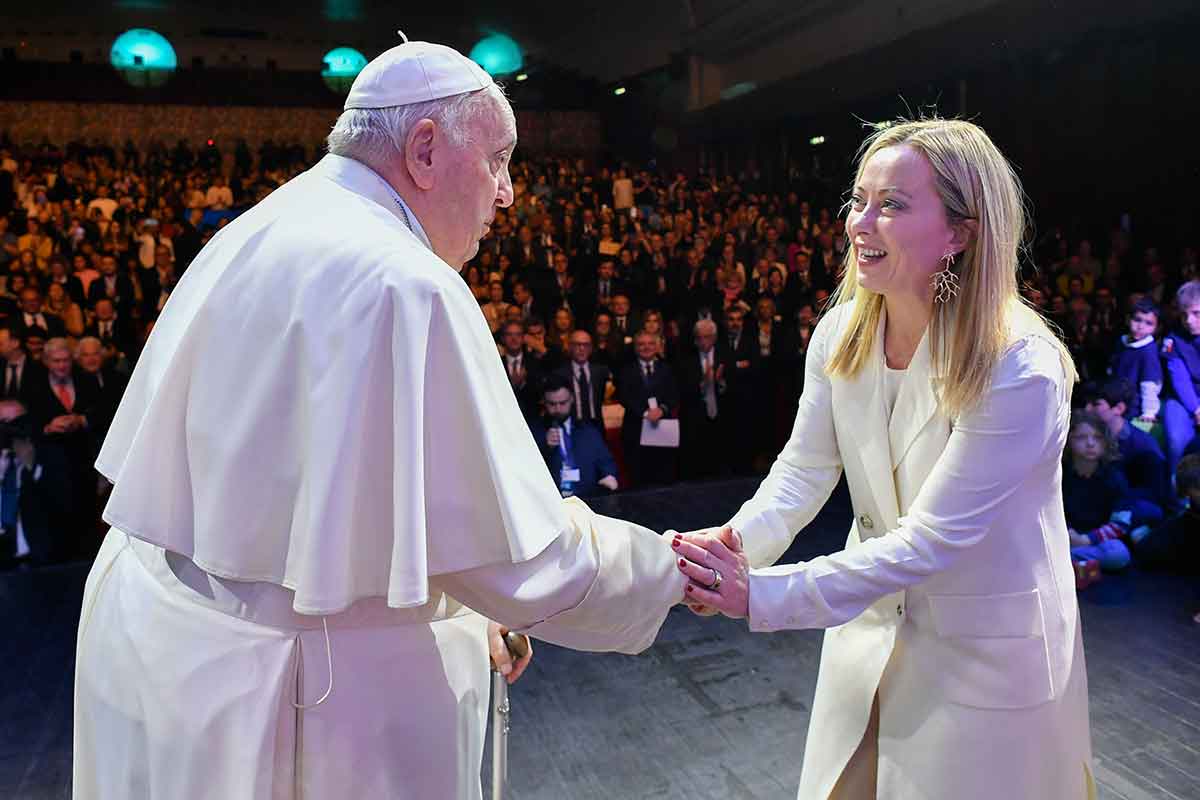 Pope Francis shakes hands with Italian Prime Minister Giorgia Meloni during a meeting about families and Italy’s declining birthrate May 12, 2023, in Rome. (CNS photo/Vatican Media)