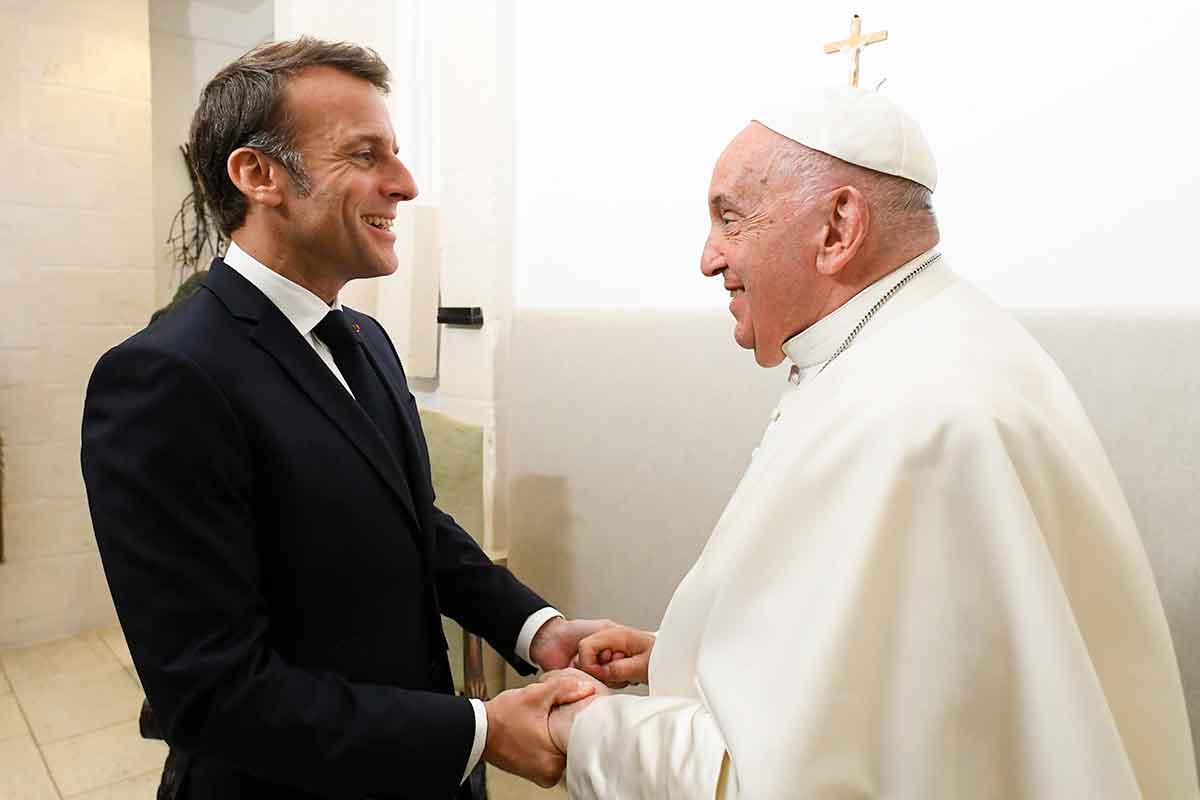 Pope Francis greets French President Emmanuel Macron during a private meeting on the margins of the Group of Seven summit in Borgo Egnazia, in Italy’s southern Puglia region, June 14, 2024. (CNS photo/Vatican Media)
