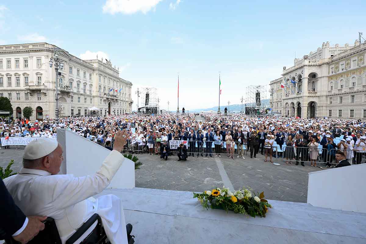 The pope was in Trieste, a port city on the Adriatic Sea close to the borders of Croatia and Slovenia, for a one-day pastoral visit which included speaking at the 50th edition of Italy’s Catholic Social Week. About 8,500 people were present for the Mass in the city’s Unity of Italy Square, including bishops and priests from the Serbian Orthodox, Greek Orthodox and Lutheran Churches.