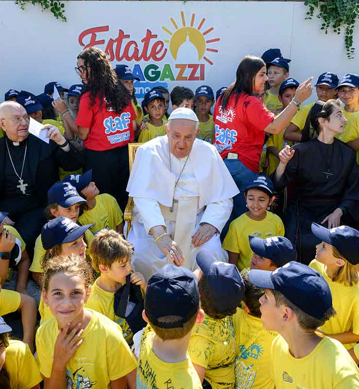 Pope Francis greets children of Vatican employees attending a summer camp at the Vatican July 18, 2024. Also in the photo are, to the pope’s left, Cardinal Fernando Vérgez Alzaga, president of the commission governing Vatican City State, and, to the pope’s right, Sister Raffaella Petrini, secretary-general of the commission and a member of the Franciscan Sisters of the Eucharist. (CNS photo/Vatican Media)
