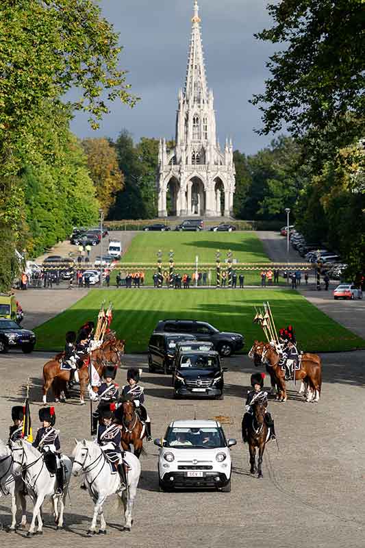Riding in a small white Fiat, Pope Francis arrives at the Castle of Laeken in Brussels to meet with Belgium’s king and with government and civic leaders Sept. 27, 2024. (CNS photo/Lola Gomez)