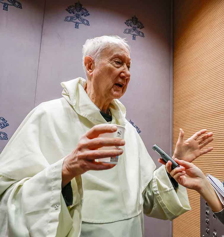 Cardinal-designate Timothy Radcliffe, theologian and former master of the Dominican Order, speaks with senior CNS correspondent Carol Glatz, during a news conference at the Vatican Dec. 6, 2024. (CNS photo/Lola Gomez)