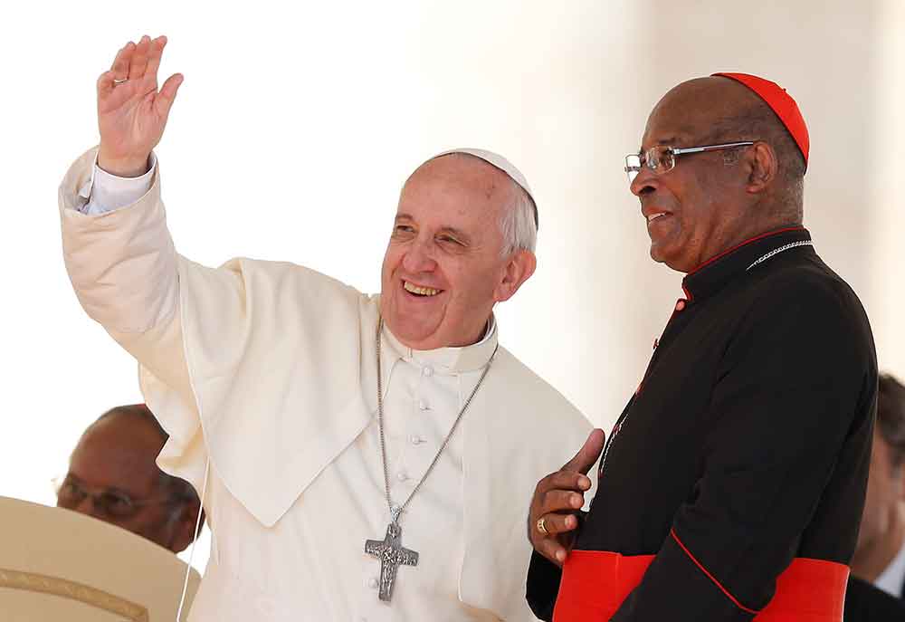 Pope Francis waves to a pilgrimage group led by Cardinal Wilfrid Napier of Durban, South Africa, right, during the general audience in St. Peter’s Square at the Vatican. (CNS photo/Paul Haring)
