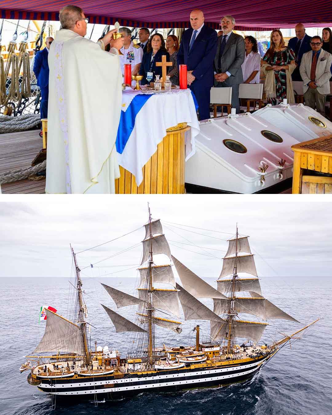Top: Father Mauro Medaglini, the chaplain onboard the “Amerigo Vespucci” – a historic Italian sailing ship – celebrates Mass on the ship’s deck in this undated photo. (CNS photo/courtesy Tour Mondiale Vespucci). Bottom: The “Amerigo Vespucci,” a historic Italian sailing ship dating back to 1931, is pictured near Rio de Janeiro, Brazil, Oct. 20, 2023. (CNS photo/courtesy Tour Mondiale Vespucci)