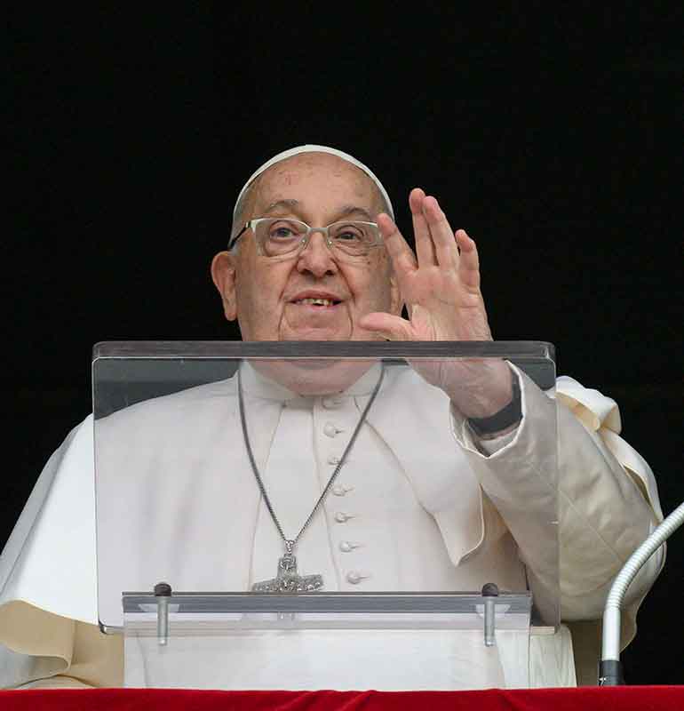 Pope Francis greets people gathered in St. Peter’s Square at the Vatican for the recitation of the Angelus prayer on Jan. 19, 2025. (CNS photo/Vatican Media)