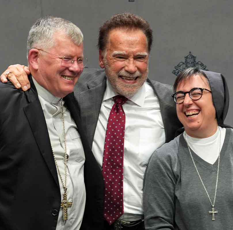 Arnold Schwarzenegger, actor and former California governor, poses for a photo with Brazilian Cardinal Jaime Spengler of Porto Alegre, left, and Salesian Sister Alessandra Smerilli, secretary of the Dicastery for Promoting Integral Human Development, right, after a Vatican press conference on “Raising Hope for Climate Justice” Sept. 30, 2025. (CNS photo/Lola Gomez)