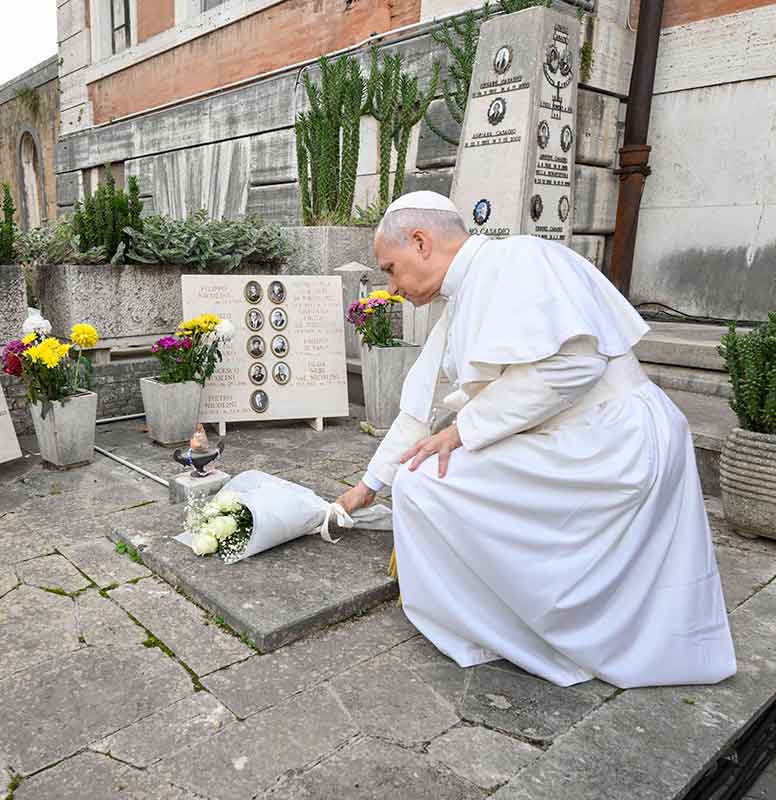 Pope Leo XIV sets a bouquet of white roses on a family tomb in Rome’s Verano cemetery Nov. 2, 2025, the feast of All Souls, before celebrating Mass there. (CNS photo/Vatican Media)