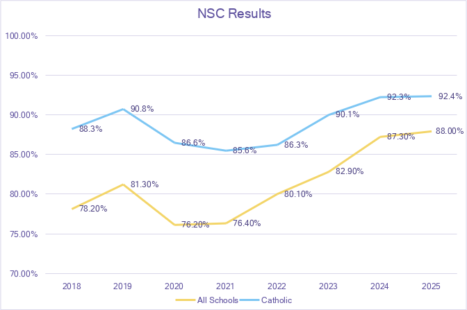 The table above indicates the National Senior Certificate pass rate between 2018 and 2025. It is worth noting that the gap between the Catholic school network and overall results is closing. This is a positive development in terms of equity. The gap between 2024 results compared to 2023 and 2022 has dropped to 4.4% above the national average, compared to 6.2 %, 7.2% and 5% in 2022, 2023 and 2024 respectively.