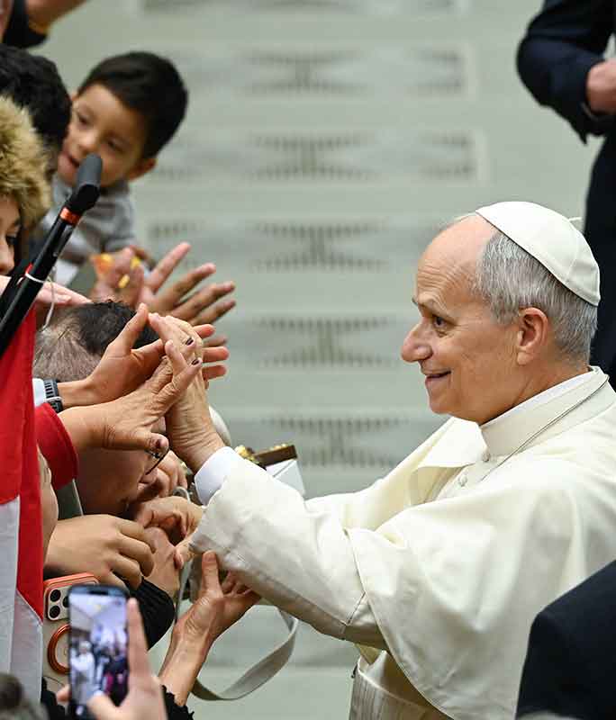 Pope Leo XIV greets people at the conclusion of his weekly general audience in the Paul VI Audience Hall at the Vatican Jan. 14, 2026. (CNS photo/Vatican Media)