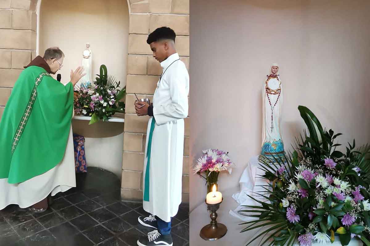 Fr Christopher Neville OFM, blessing his gift to the Church, a statue of Our Lady of the Tabernacle, at Blessed...