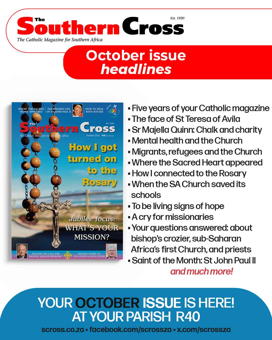 • Five years of your Catholic magazine • The face of St Teresa of Avila • Sr Majella Quinn: Chalk and charity • Mental health and the Church • Migrants, refugees and the Church • Where the Sacred Heart appeared • How I connected to the Rosary • When the SA Church saved its schools • To be living signs of hope • A cry for missionaries • Your questions answered: about the bishop’s crozier, sub-Saharan Africa’s first Church, and priests • Saint of the Month: St John Paul II