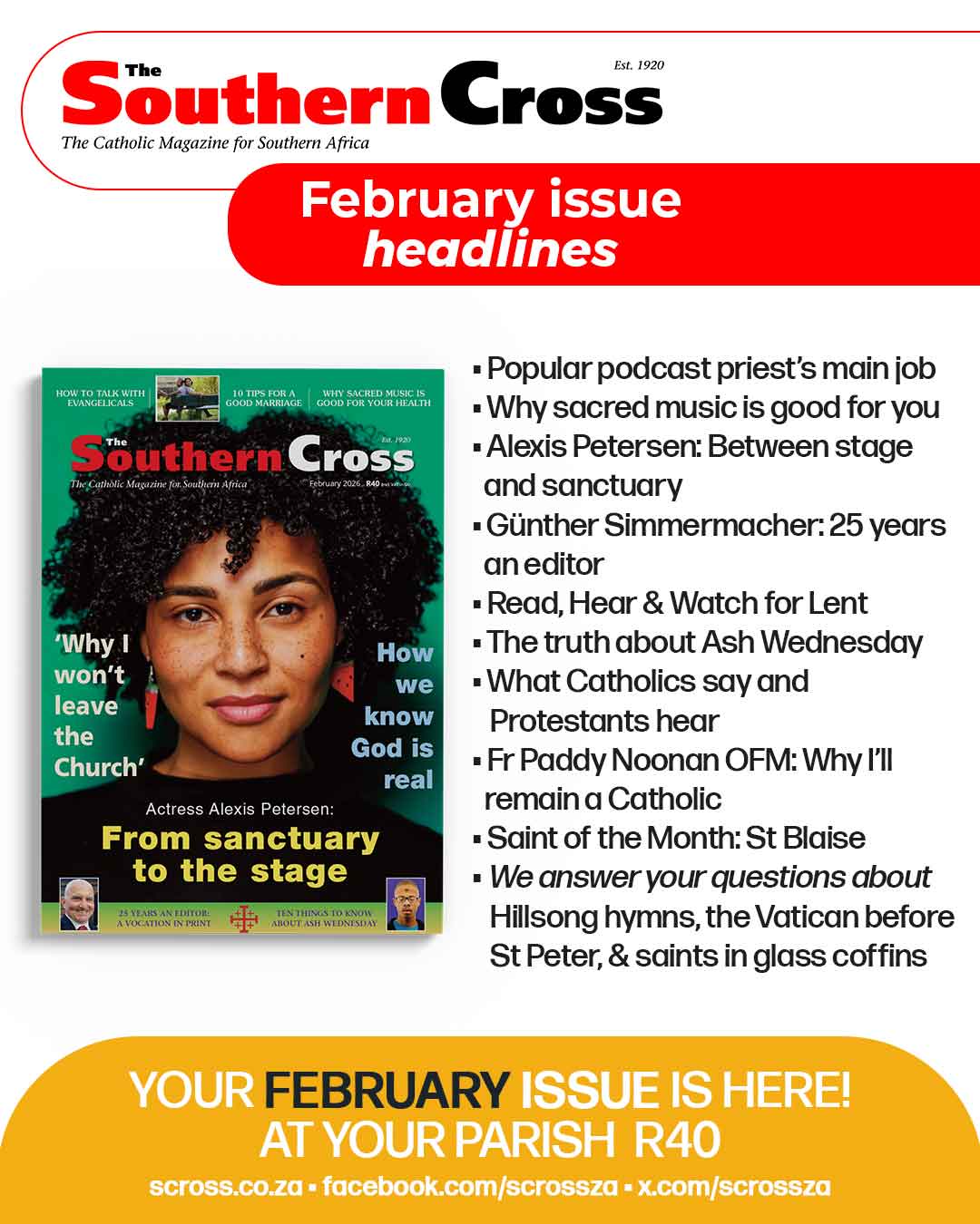 Pick up The Southern Cross magazine at your parish for R40. Not there? Contact to order or order for your parish online. Choose your subscription options of 6 or 12 months digital or print subscription or a digital/print combination delivered to your home, onscreen, or to your parish.