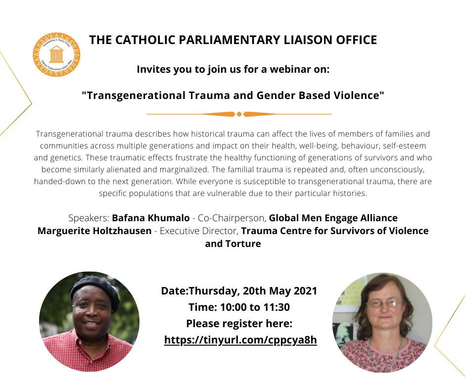 The Catholic Parliamentary Liaison Office is holding a webinar on Transgenerational #Trauma and #GenderBasedViolence with speakers Bafana Khumalo and Marguerite Holtzhausen...